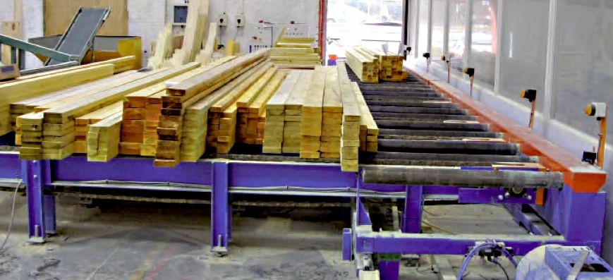 Drewno jest przesuwane na napędzanych rolkach do właściwej lokalizacji piły.
